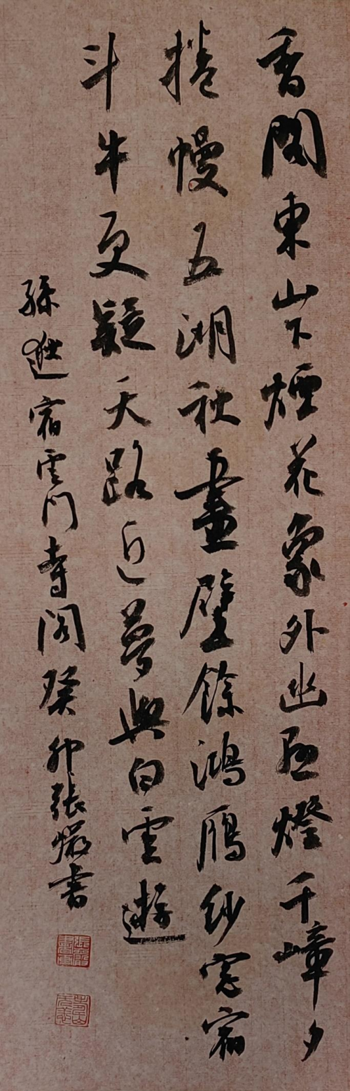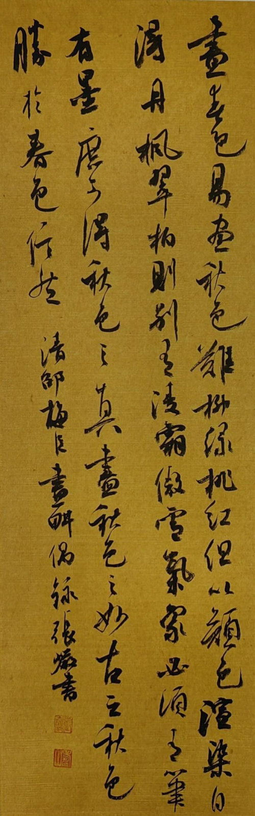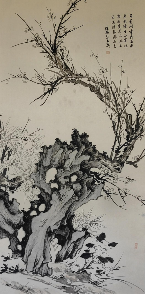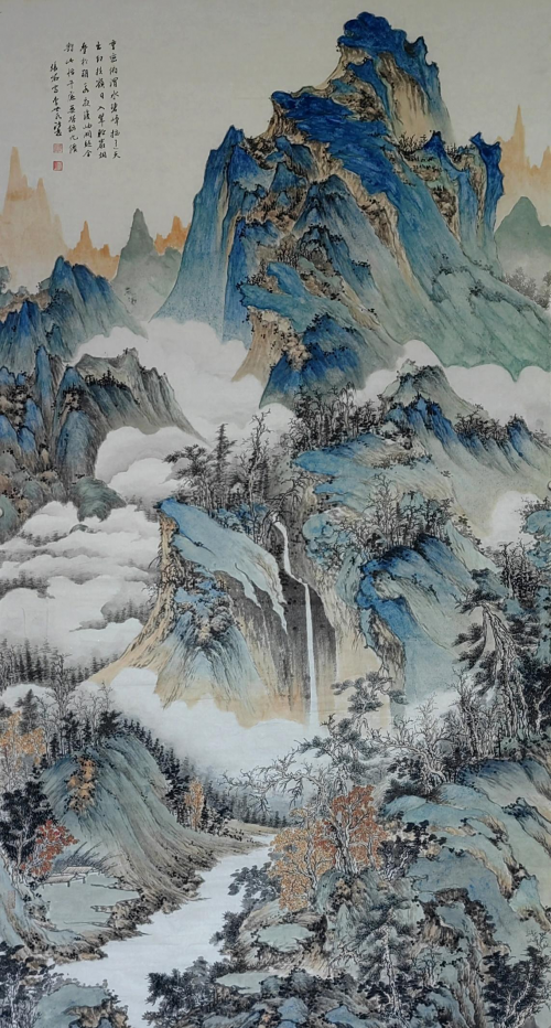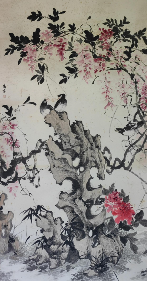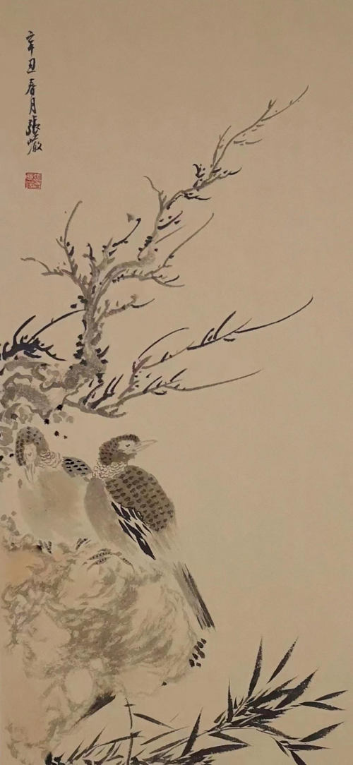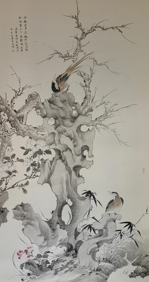 由此而下,进入元代、明、清经典绘画。通过几个来回往复,张岩对于中国绘画经典作品的审美精神已经有了深刻的体会。表现在绘画作品上,如《见静境天真》(138*40cm 2007年)、《灵鸟飞来站好枝》(130*40cm 2007年)、《万和松涛裹泉声》(200*80cm 2009年)等一些列作品,画面上除了严谨的法度和技巧外,还充满了诗歌的优美意境。可以说,他抓住了中国绘画的美学精神和审美本质,无论是山水画,还是花鸟画,如果是缺乏诗意的,那绘画就无异于图案了。 对于经典绘画的研究和品读,逐渐确立了他自己特有的中国绘画美学的审美体系,这个体系指导着他的创作,因此我们审视张岩的绘画,他的变化不是盲目的,而是在这个体系化的指导下进行的。