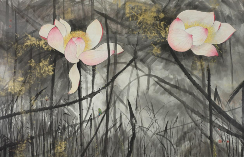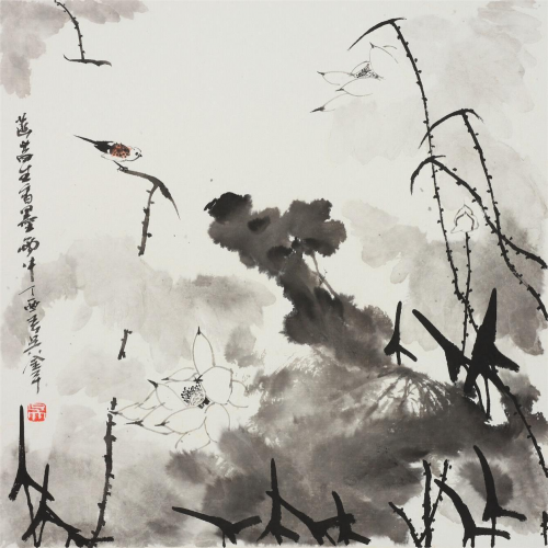 《菡萏生香墨雨中》55×55cm 2017年 |