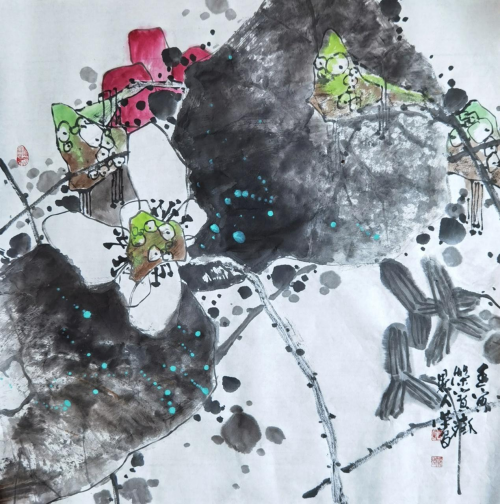 荣昌老师告诉我,这幅作品是他超凡脱俗的创新之作,化境入境,化神入境,化境入神,以清纯与高远,简约与禅缘相结合的诗意般存在。荷的世界丰富多彩,莲子、花瓣、水草都有内在的生命气质与个性,蕴含着自然而然的超越梦幻的旷邈之美。通过各种各样的形态变化,体现了画家内心强烈的意念和炽热的情感融铸,表现了内敛含蓄的美与繁茂浓郁、干净无暇的生命气息。莲花的红,有如女性的唇红,静谧里有一种淡然而又充满爱意的韵味。剥开隐秘的莲子用印象派的技巧,让其变形后有无数双眼晴闪烁,充满了无限生机与个性魅力。使我想起了莫奈的《四季睡莲》,构图、布局、形态、韵律以及所展现的宁静、温馨秘境,虽不相同,但各具特色,其表现生命的共情共性存在的意义与价值之内涵是一致的。业内专家对这幅作品给予了高度评价:“突破历史,突破当下。”