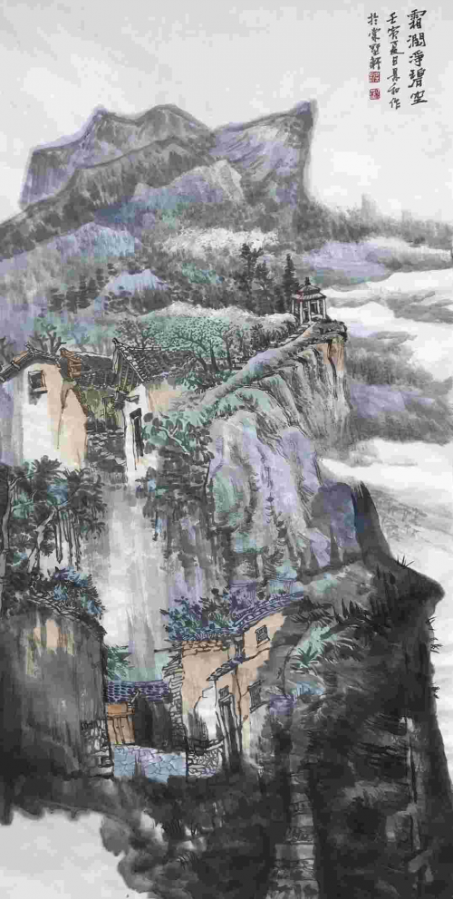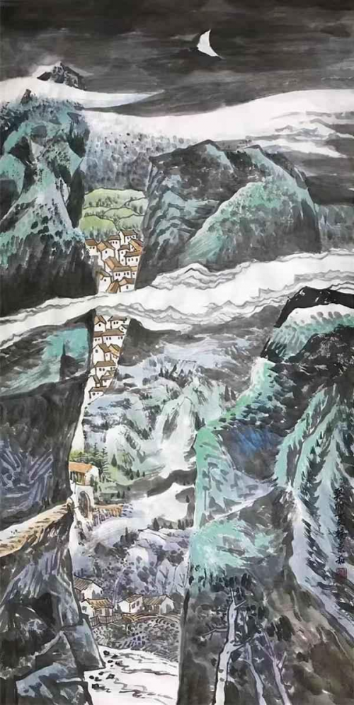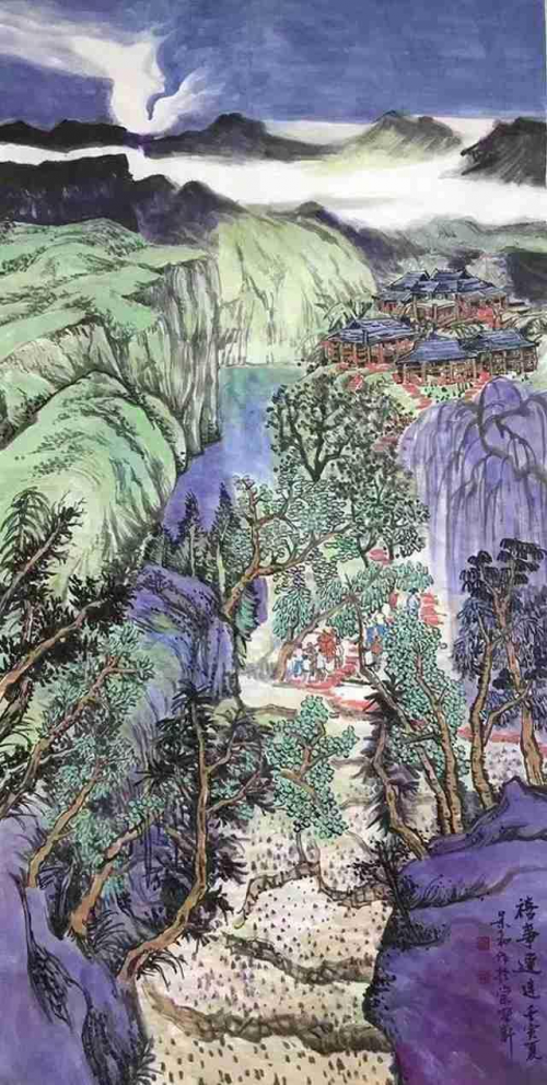 创新不作无根基的创新,必需要在传统技法的基础上作新的拓展和发挥。这是杨景和的山水创新的原则,所以他的山水站在现代主义的奇幻视角去渲染,却不会失去东方审美的根本属性,仍旧是中国画的身份与高贵,处处体现了中国传统绘画的精髓。比如在整体上画面布局严格遵循传统山水画的构图法则,以山原川泽为脉络,将景物有机地组织在一起,三远相辅相依,节奏生动,画风严谨。