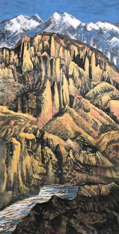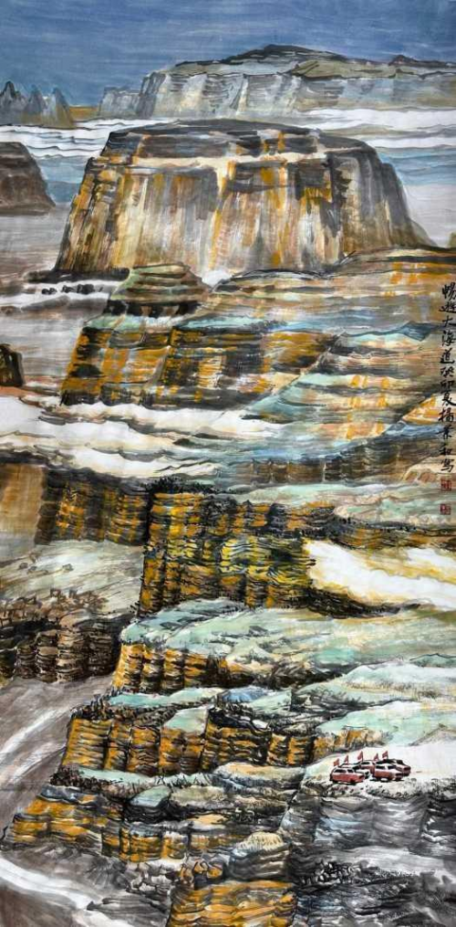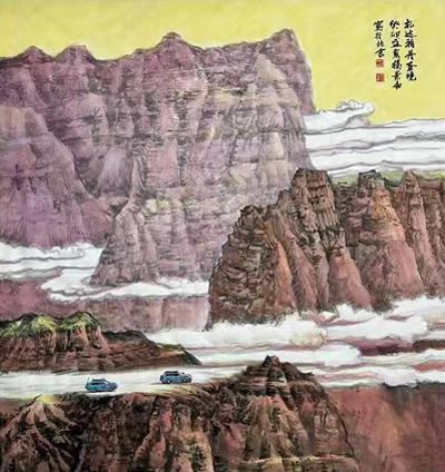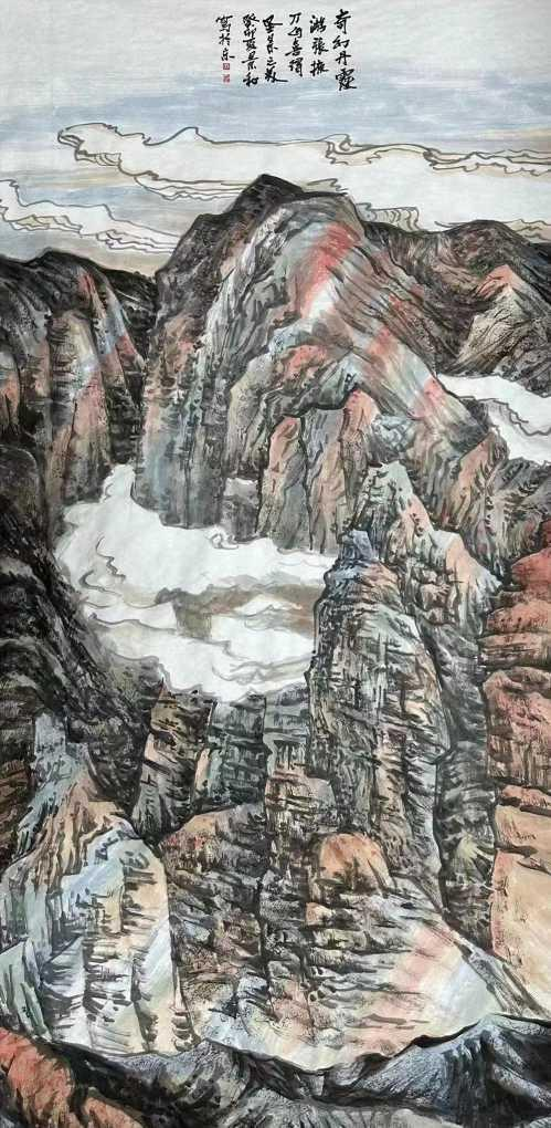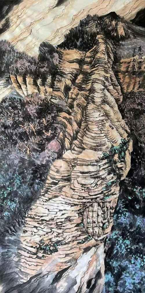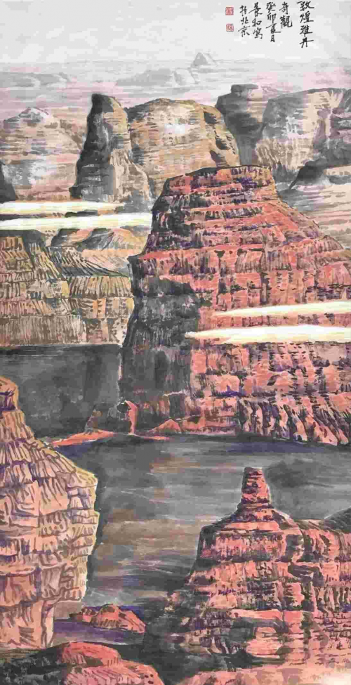 又看到《敦煌雅丹奇观》在色彩水墨的渲染上,明显是善于随类赋彩的传统。又有运用冷暖、补色等对比的调节机智,以营造出景物的光影效果和空间感。通过细腻的笔触和绛色复沓的色调变化,描绘来源于现实,却又出彩于幻想的奇观魅力。把原生态的雅丹地貌塑造得宁静安详,飘飘富有仙域印象。这种创新的幻境艺术风格,使得他的作品亘古未见,为美术创新树立了一个标杆,也为美学发展引导出奇妙的方向。所以他发出创建奇幻山水的倡议之后,为之喝彩的回声响亮,许多的艺术同行向“奇幻山水”聚集,形成了中国画风的新课题、新组织、新派别!