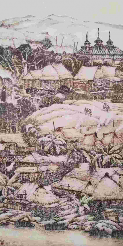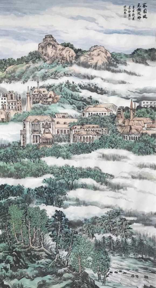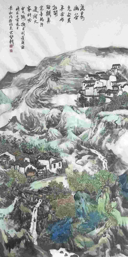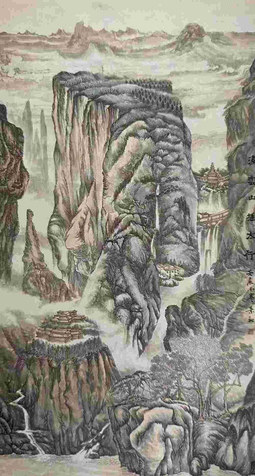 奇幻山水代表作《爱心瀑布》《都安世外桃源》不仅展现了杨景和对传统文化的敬畏和热爱,也展示了他对现代艺术的探索和追求。奇幻山水的可贵品质,还在于并不是远离现实生活的阳春白雪,而是在奇思幻想山水画里承载下许多文化价值和社会责任。他不断通过自己的作品,传达出人与自然和谐相处的理念,全力弘扬中华文化,推动文化传承与创新。这就让他的作品不仅具有艺术价值,更具有社会意义和责任。例如,他的作品《亭亭双浮图》中,通过描绘自然环境的文化传承的关系,引导人们的目光聚焦于文化图腾,传达出文化寻根意识,这也是杨景和山水画的重要特点和价值所在。
