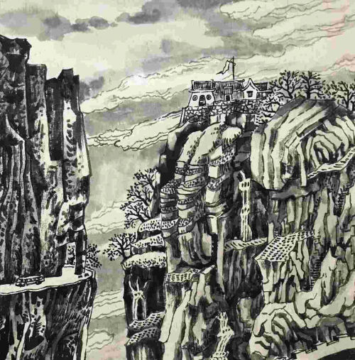 例如《人间仙境》很全面地继承了传统山水画的多种构图形式和表现手法。注重气韵生动,追求意境高远,以诗意的笔触勾勒出山水的神韵。在表现手法上,他运用线条、墨色和色彩等多种元素,通过虚实、黑白、浓淡等对比,表现出景物的立体感和空间感。同时,他还融入了现代绘画的元素,如透视、光影等,使画面元素更加丰富多元,有很强的可读性和美学装饰性。在细节上大胆地运用夸张、幻境的艺术手法,以丰富的笔墨和色彩表现出“超自然”山水的神奇气韵。这种风格既展现了传统山水的韵味,又展示了现代艺术幻想的无限魅力,这是奇幻山水画的一大特色。