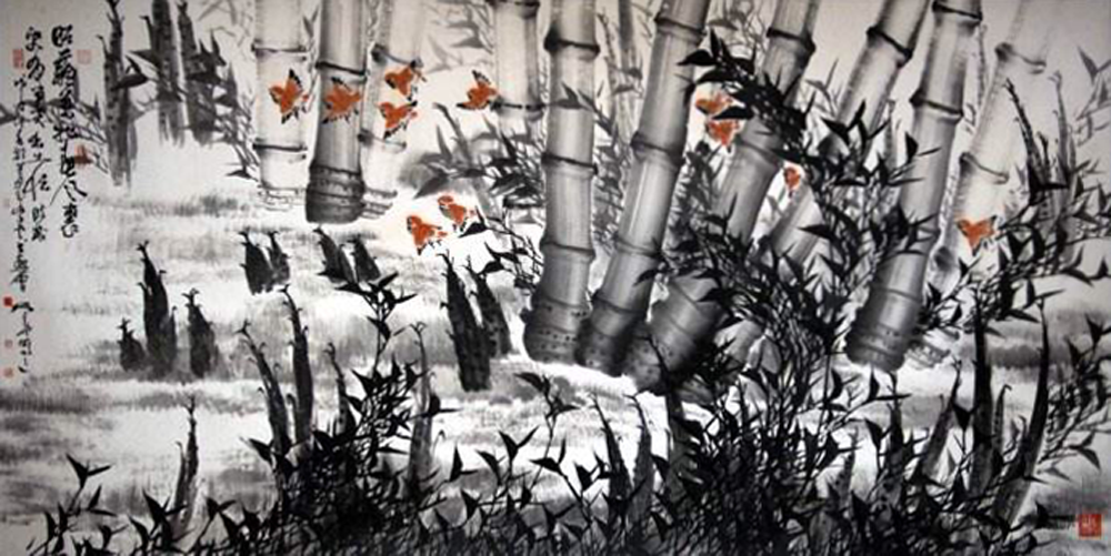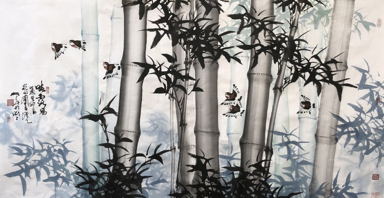四、走出大山 林立中的国画,师法自然,广揉国内外名家风格与技法于笔端,大胆泼墨,勇于创新,意境隽永,不落旧套。林立中更善于画竹,他删繁就简,疏密相间,浓淡相宜,颖妙成趣。有时看似寥寥数笔,却又竹影横生,妩媚婆娑。他画的竹虚怀向上,清新典雅,丹青天成,有新时期的中华气象,谓“盛世中华竹”。 他画山水、花鸟,有时酒酣性至,信笔涂来,不受拘束。或书或画,篆笔中锋,笔墨苍劲,龙走蛇游,一气呵成。林立中的画得益于书法功底、文学修养,他的书体多变,行草隶篆兼融。干笔如秋风枯树,湿润含春雨带露,既有现代书法的豪放、不拘,又有传统笔意在扎实、章法。