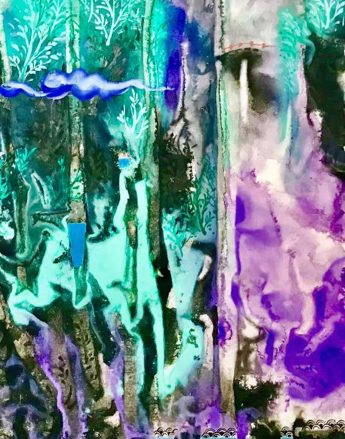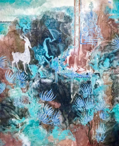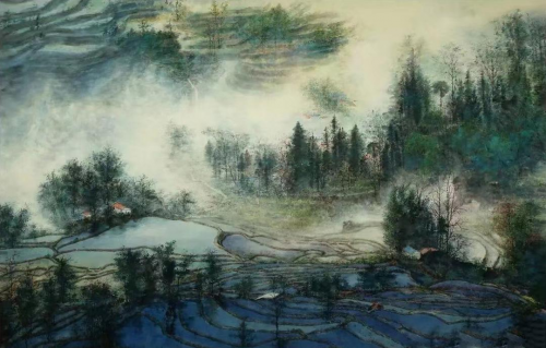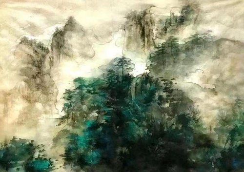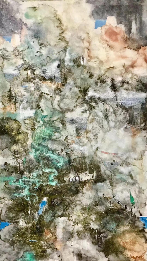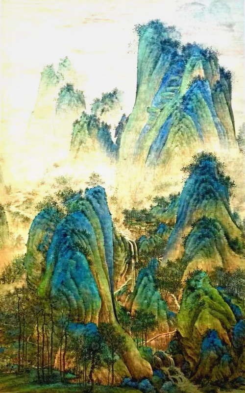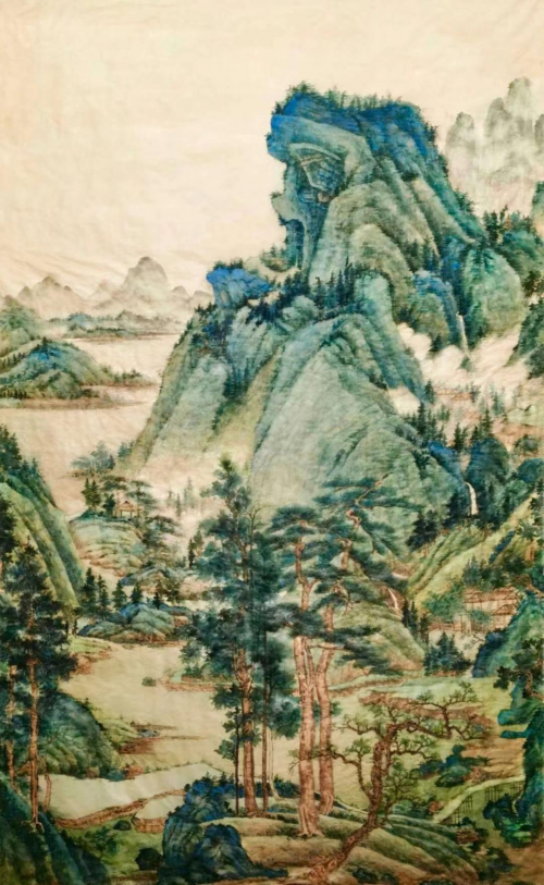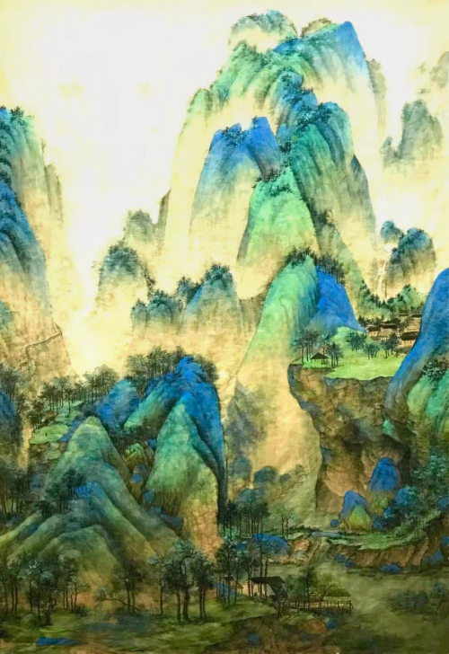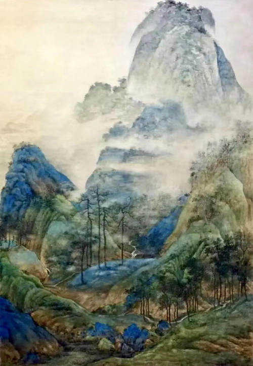 《山境·瑞香拂云》208×125.8cm 绢本青绿山水 众所周知,在传统的中国画中,色与墨是有矛盾的:重色会轻墨,重墨会轻色。早在唐朝,中国绘画中的色彩达到一个鼎盛后便逐渐趋于平淡,同时水墨的运用得以提升。如五代荆浩在《笔法记》中也不讲色彩。水墨画逐渐成为主流,但这不意味着色彩的退出画坛。事实上,中国画一直重视色彩。清方熏言:『设色不以深浅为难,难于彩色相和,和则神气生动。』『设色妙者无定法,合色妙者五定方,明慧人多能变通之。凡设色须悟得活用,活用之妙,非心手熟习不能,活用则神彩生动,不必合色之工,而自然妍丽。』沈宗骞曾说:『墨曰泼墨,山色曰泼翠,草色曰泼绿,泼之为用最能发画中之气韵。』此中『泼』即是以饱含墨汁或色彩的笔墨来皴刷。到近现代,关于色彩更是发展出泼彩这一类别。张大千认为泼彩和泼墨同出一脉,是传统中国画的创新。