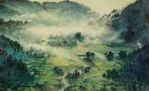 《春山叠翠》68×148cm 纸本 显然,卲震山先生走的是与古为徒、与古为新的路径,这需要有极强的文化定力和『血战』精神。他自己便言:『画家当以古人为师,而后亦当以天地为师。以古人为师,专研画艺,穷研古贤之长,应广涉王维、杨升、王洽、董源、巨然、惠崇、「二米」、范宽、郭熙、李唐、「元四家」、沈周、文征明、董宗伯、「清四僧」、「四王」、龚贤等,此所谓与古之诸家血战也。而后遍游名山大川,须去领略惊心洞目之观,一味困坐斗室安能与古人抗衡。真能涉此而悟道,变通而得道,可一超直入如来地也。』卲震山先生所提之人皆为几百年一遇之大家,他愿与之血战,可见他的心之坚,他的立愿之高远,他想借此『直入如来地』。