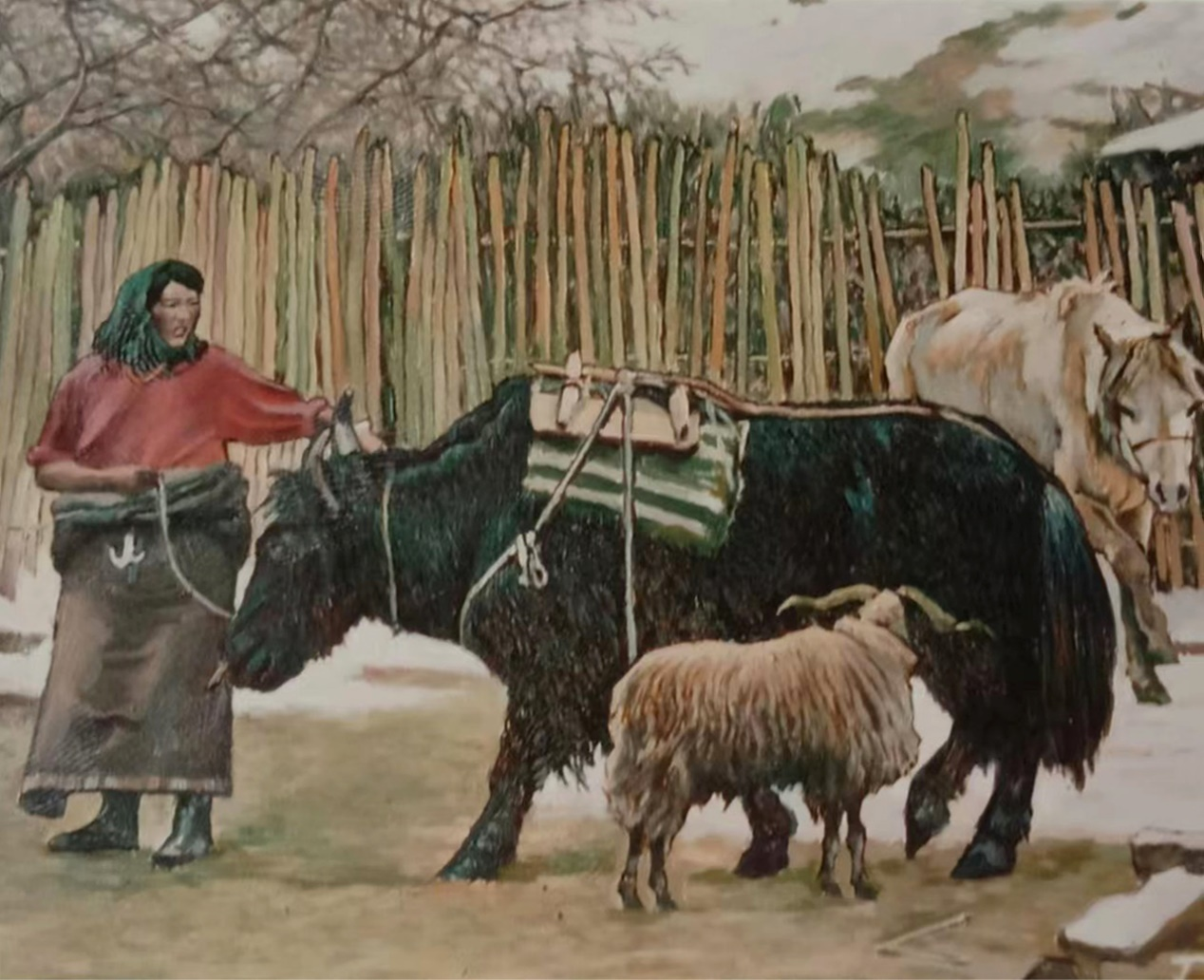 《转运图》颇具匠心,通过从天津港繁忙的装卸,华北大平原上满载的列车,阴雨泥宁豫陕道上艰难前行的人力兽力车队,层层递进,将大转运的重头戏推向了画幅的最显眼处:这是自西安至兰州的六盘山区,坡道崎岖,大雪飘乱、驷马赳赳,肩夫咻咻,高车重载,咫尺千钧。画家运足笔气、墨气、色气,营造气势、气度、气机,总揽浩然大气于画幅,生生不穷,风动云涌。那股陇人特有的气质和神韵油然而生,感染着画卷前久立的每一位读者。