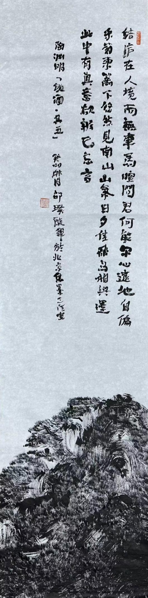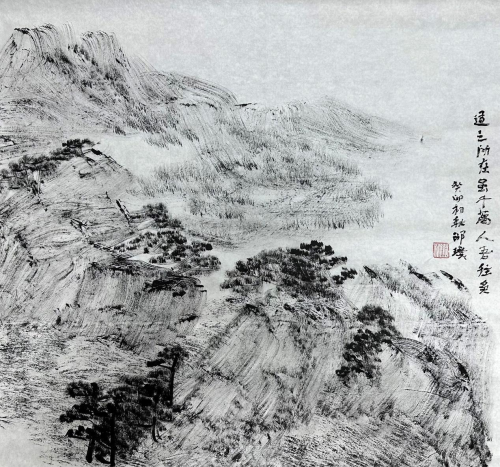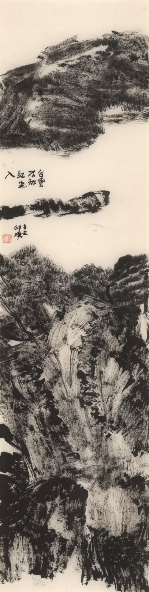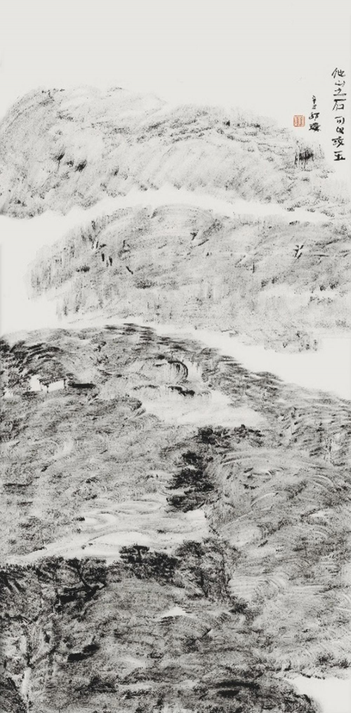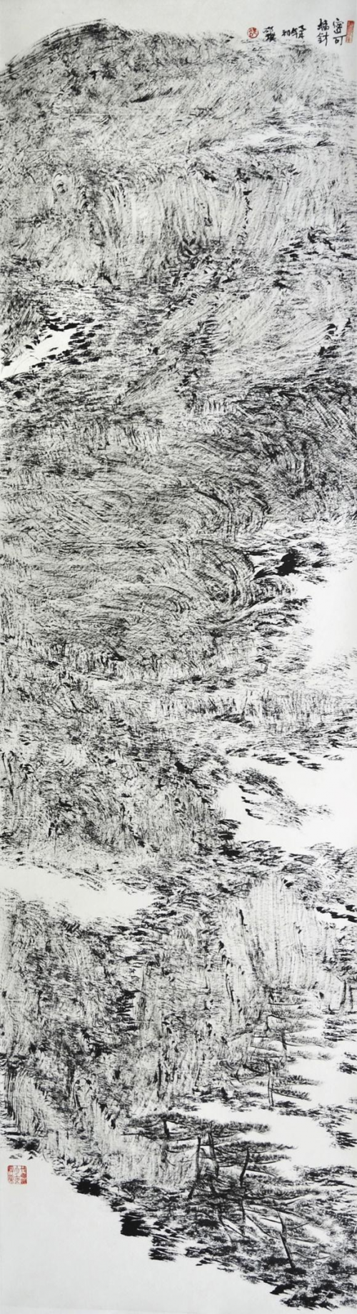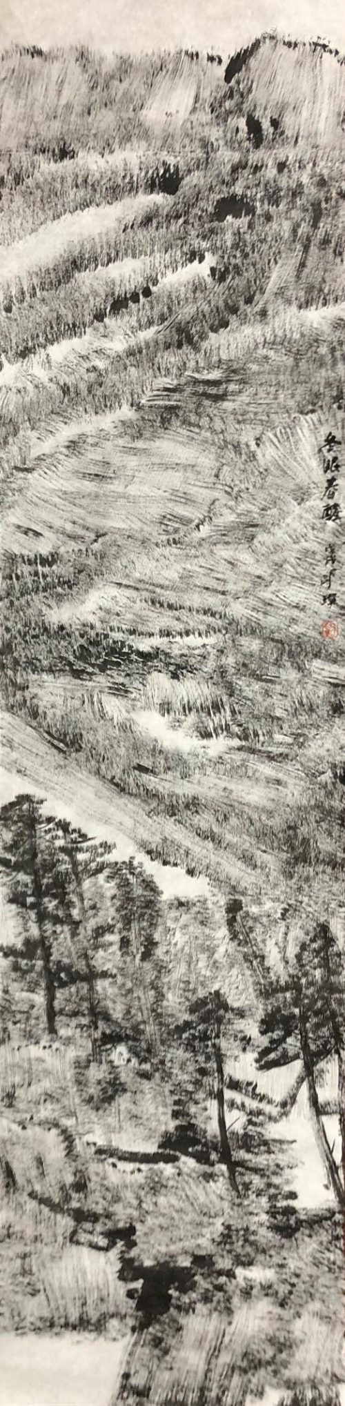 尚辉: 邵璞的焦墨更多来自心象图式总是将线融排为面,探索了焦墨笔线有序排列形成块面的可能性。因而,邵璞的焦墨山水画以灰调的块面取胜,多层灰调块面相互衔接咬合,织构出其画面辽阔宏大的中、远景气象,他甚至极为珍惜画面浓墨的使用,乃至整个画面均以灰调呈现。这种灰调形成了他对淡墨铺染中、远景画法的挑战。应当说,这种灰调中、远景虽貌似淡墨晕染,但这些灰调块面的形成均以焦墨枯笔的排笔构成,其枯其焦所形成的枯淡与高远均非淡墨晕染所能及。这正像清初“四王”山水的笔墨境界,其枯淡枯润都绝去用水较多的淡墨晕染。这里体现了中国山水画用笔的非凡价值,也即,只有深厚的腕力笔功,才能真正形成枯膏简远的境界。从这个角度讲,邵璞虽没有表面地承袭“四王”笔墨衣钵,却远接其枯膏的精神。这正是邵璞将焦墨引向中国画笔墨境界的深刻之处,从而也将焦墨的画理与传统笔墨进行深入的对接。 作为一位诗人,邵璞的焦墨山水也展现了更加丰盈的激情与浪漫。这使他和上述相对画得较实的焦墨山水画拉开了距离。《冬眠春醒》《踏春一时》《白云不放红尘入》和《春泊秋岭间》等,所画春景皆不是某处山景的描绘,而是心中春之意象的呈现。也因此,枯笔焦墨的序列铺排都不是一种技巧的展示,而是内心情感的外溢、内在精神的彰显,仿佛那些焦墨枯笔的连接之间始终流涌着一种豪情。从这个角度讲,他的焦墨创作已将焦墨艺术推向情感表达的承载物,而不是就焦墨谈焦墨的语言苑囿。邵璞的焦墨山水无疑打开了焦墨艺术更广阔的天地,而这种开局更深刻地连接了中国文人画博大精深的传统笔墨体系。