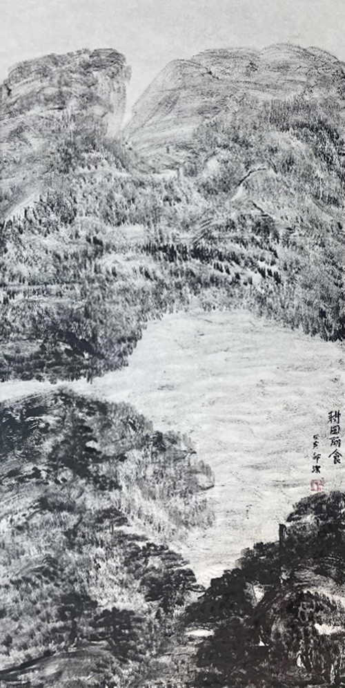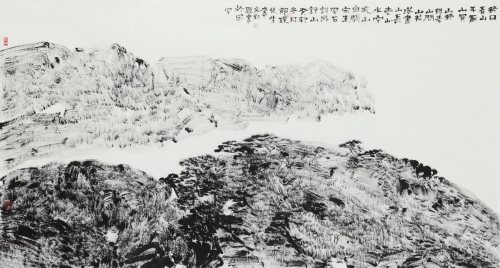 黄丹麾: 邵璞的焦墨山水画就是将海德格尔、儒家、道家与禅宗关于大地的哲学理念有机集合,以笔墨审美图式,体现出艺术家对苍茫大地的哲学反思。南宋邓椿在《画继》中曾说过:“画者,文之极也。”极好地诠释了文与画的关系。文人画起源于魏晋,发轫于宋代,宋代文人士大夫把绘画视为文化修养的重要部分,出现了很多鉴赏家和画家。邵璞作为诗人,具有雄厚的文人修养,其作品体现出诗心与画韵的结合。以诗入画、以书入笔、以文入画。 邵璞先生的焦墨淡雅、朴拙、简括、苍茫、华滋、润泽,体现出“境生象外”“大道至简”“大美无言”的艺术境界。邵璞的山水画无论构图、笔墨,还是设色、意境都是务求简洁、力避繁杂。他的作品可谓“笔简墨精”,作者不是对审美物象进行面面俱到、事无巨细的描绘,而是有所选择、有所取舍,抓住最能表现对象本质的典型形貌特征,从而达到“窥一斑而见全豹”“见一叶而知秋”的艺术效果,艺术家的这种概括能力和锤炼本领,使他的“笔”与“墨”能够“举一反三”“以一当十”,在有限的语言中揭示出无限的心象。 邵璞将中国山水画的浓重、浓淡相间、浅淡与西式素描中的黑白灰有机合璧,其作品具有崖刻般的力量感和纪念碑式的雄强感,短笔皴擦与西画的笔触、肌理具有相通之处,这种简括苍劲又和黑白版画具有异曲同工之感,他的皴法既有横向散扫,也有纵向积染,纵横交错之间凸现天地苍茫之貌,我们可将此种皴法姑且称之为网格化皴法。他的焦墨画不是黄宾虹等人追求的浑厚华滋,而是朴拙苍茫,这种大道至简之美既不同于古人,也有别于当代艺术家,属于他个人的艺术符号。