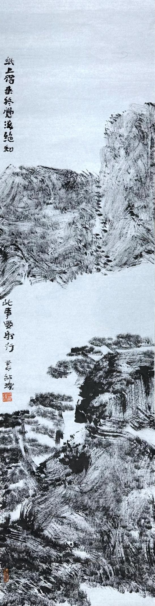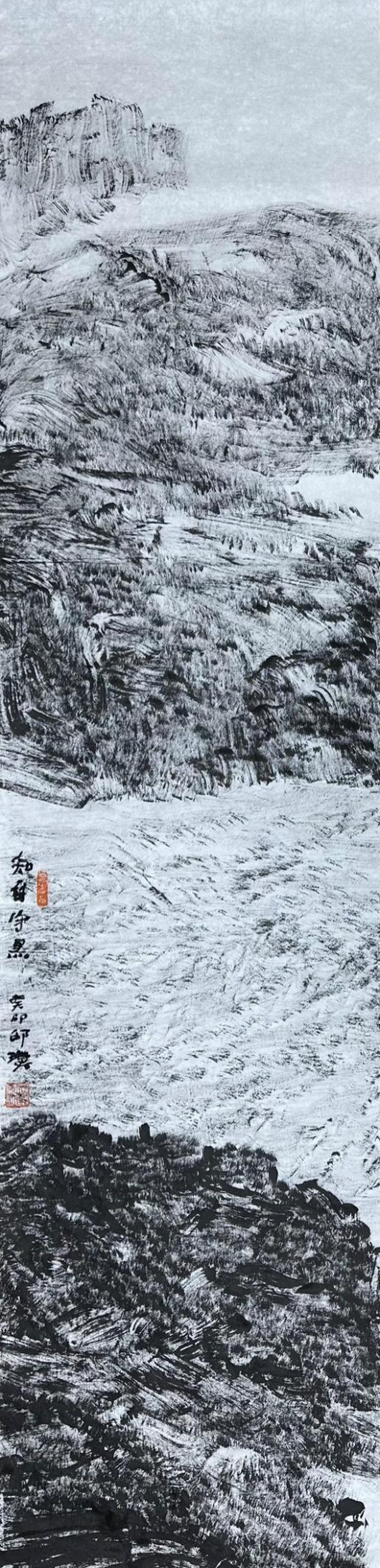 曾陆红: 邵璞的焦墨画长卷是全景式构图,类似王希孟《千里江山图》及张大千《长江万里图》的气势之磅礴,从这种大场景、大构图中可以感受到作者内心的豪迈之情。邵璞的焦墨画,用笔恣肆而灵动,似随性而发;用墨蕴意高古,线条刚健遒劲,点染皴擦交相辉映,画面简洁、空灵却内涵丰厚,笔墨意趣得以充分地彰显。邵璞善用枯笔,画面多呈灰色调。焦墨的核心是枯,枯里有墨的五色,枯里有墨的质感,枯里有力透纸背,枯中的笔千变万化。邵璞让笔墨蕴含的焦墨表现力得以显现,让书法之美得以在中国画里有序有形有声有色地焕发!虽“干裂秋风”却有“润含春雨”的效果,具有较强的视觉冲击力、韵律感、节奏感和自己独到的审美追求和情感表达。邵璞的画、乍眼一看,似乎是“逸笔草草”,近看远观,画面效果却各不相同。邵璞先生虽然用的是传统的毛笔,却有油画大排笔挥洒的激情。通过他的这种笔墨的挥洒,我们仿佛看到了类似傅抱石的《抱石皴》那种手法和效果。邵璞所表现的自然山川丘壑,有一种混沌初开的原始状态,但是它们充满着自然内在勃勃的生命力。诗风浩荡,苍茫壮观。故画展取名为苍茫大地。邵璞的焦墨画是一种通过笔墨彰显主体精神的“意象性山水”,正如画家本人所说“焦墨山水是一种写作式的中国山水画,画的是山水,同时是心境。”邵璞表现的山、石、树、木及云等自然形态,具有个人绘画符号的特性,呈现出“象外之象”的抽象效果。也许“山不像山,其山自在;水不像水,其水自流。千山万水,画理尽在其中”。本次展览,让我们清晰地看到邵璞先生作为一个诗人画家的“文人精神”以及诗情、诗意对笔墨的内在影响力和相互关系。邵璞的绘画丰富了焦墨有史以来的表现样式、技巧和面貌!这个展览既是邵璞焦墨探索一个精致的总结,若能推动当代中国焦墨艺术发展,它的意义不言而喻。