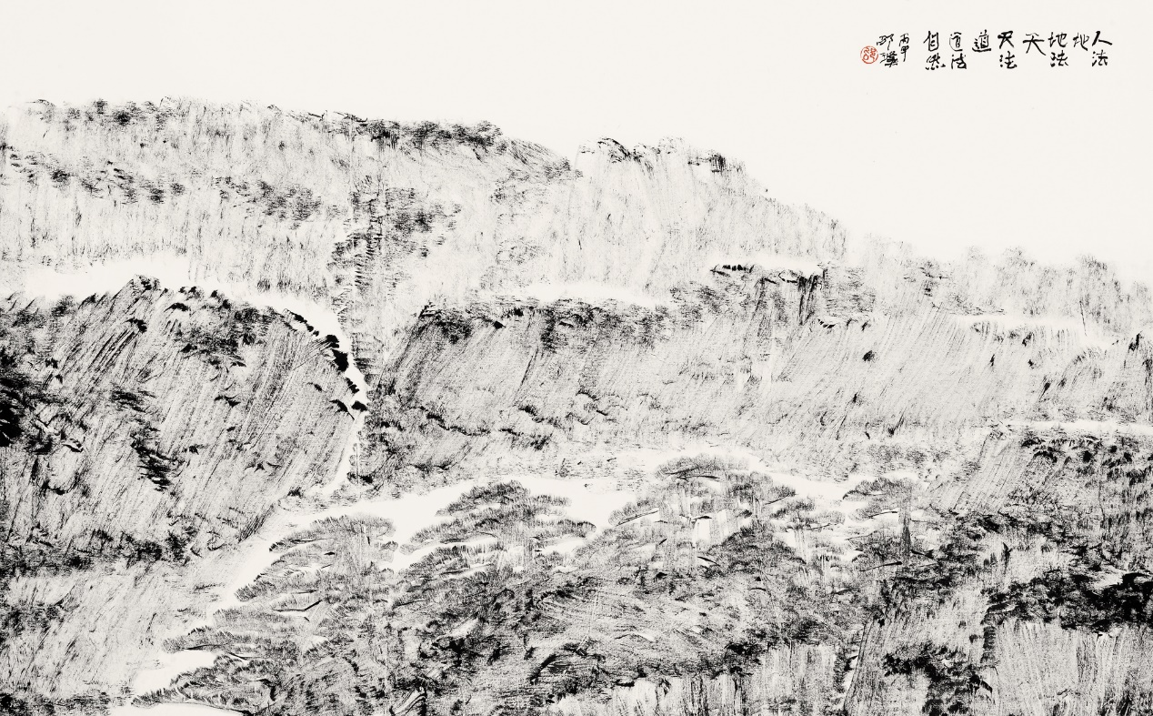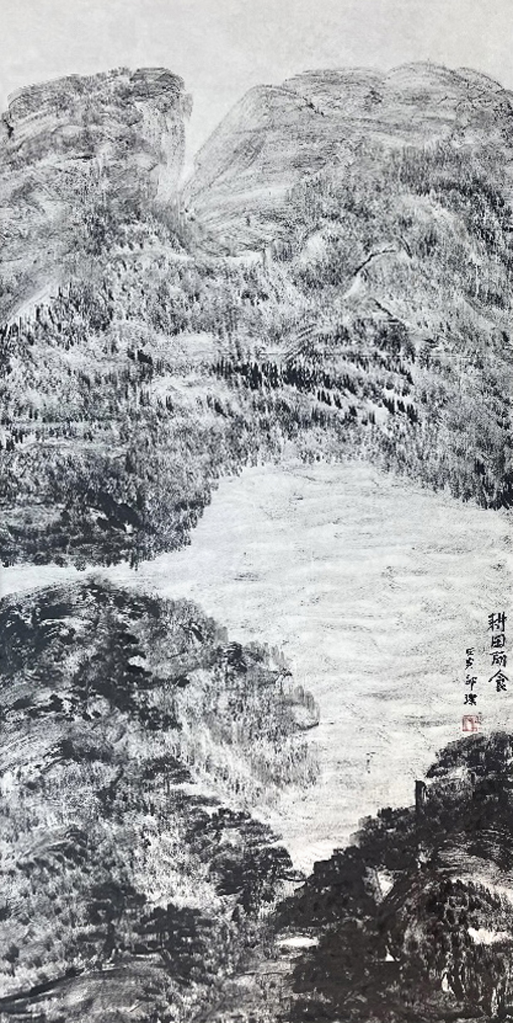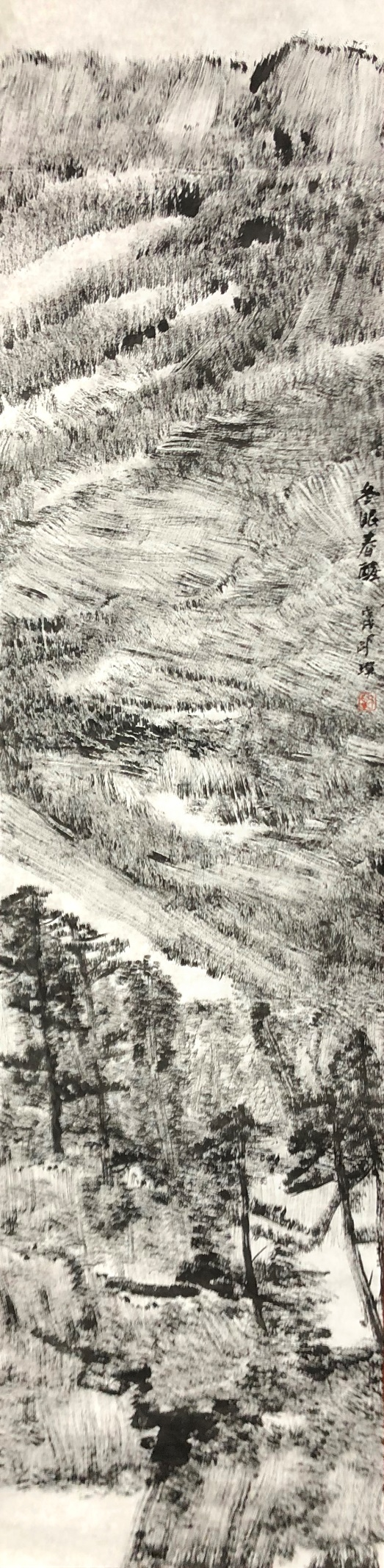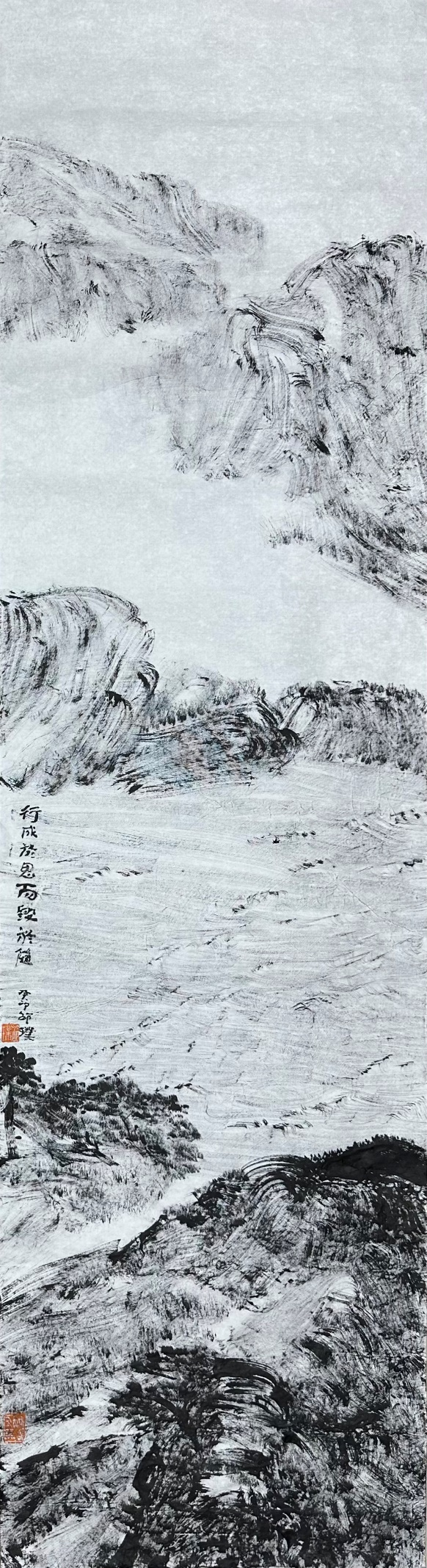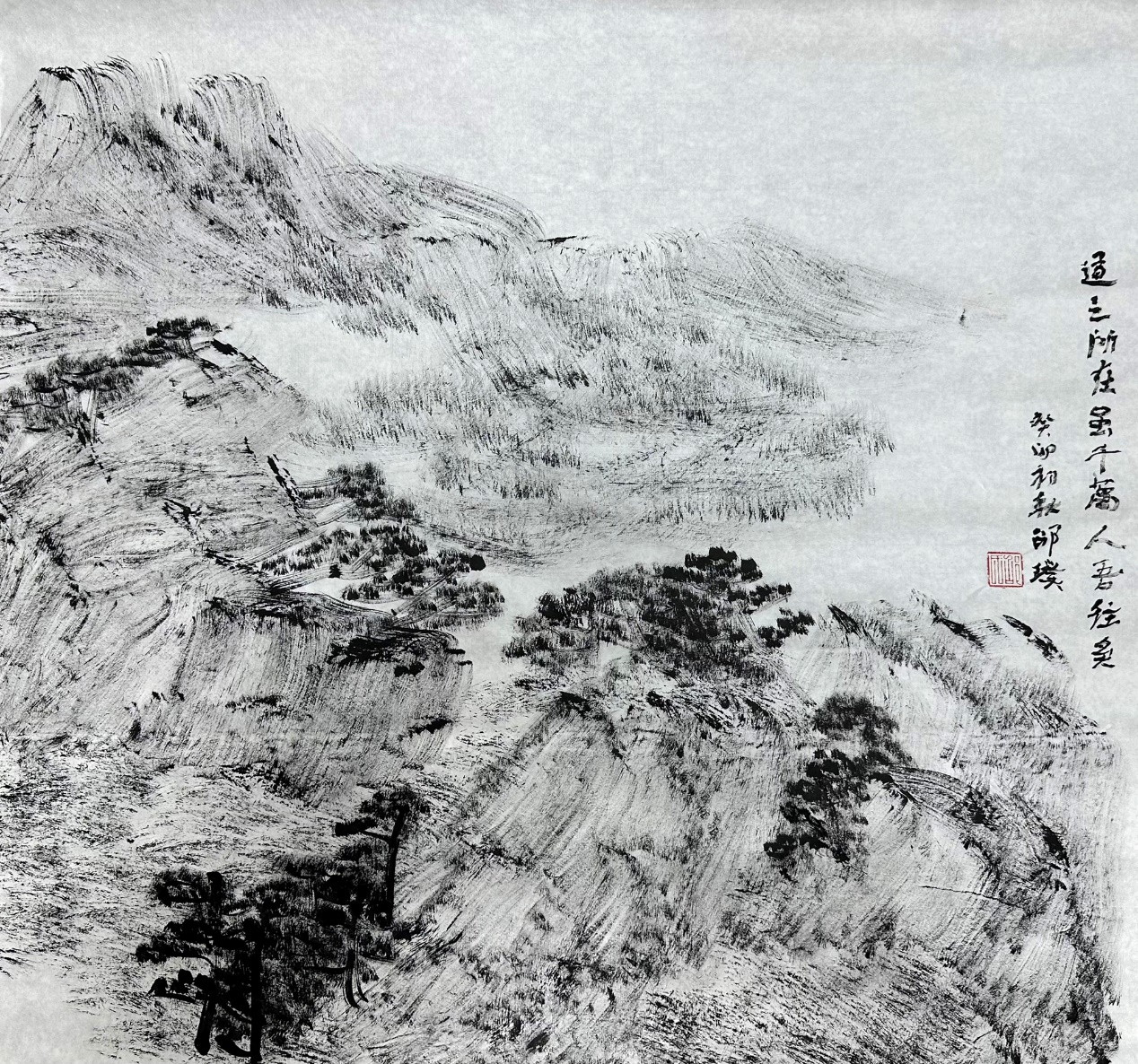 吴长江认为,在艺术创作过程中,国画家都脱离不了受西画、中国画或者书法的影响。“邵璞受西画最大的影响是注重画面的整体感,比如说黑白灰、空间、布局,既是中国传统的方式,但是整体布局上又强调整体感,我觉得这些影响、变化,都是为了画面的整体空间、造型。所以很难预测到他的焦墨艺术朝着中国画方向,空间越大,还是说再借鉴,也有可能走着走着更抽象,用几大块的黑白灰来处理他的画面布局。比如展览作品中山水构图上,有的作品上头有一块灰的或者浅灰的,将来变成了另外一种形,它的张力可更大,这都得画家探索,而且要大量地实践,在这方面的实践邵璞有他的真知灼见。