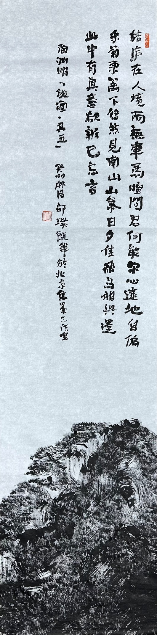 中央美术学院教授吴长江曾担任中国美术家协会分党组书记、常务副主席,擅长于素描、水彩、版画等。看了邵璞早期的水彩和油画,再看邵璞的焦墨创作,他说:“邵璞的焦墨探索有一个过程。我觉得邵璞焦墨作品画面中的视觉空间宏阔而且有很多变化,可以看出他的焦墨山水有他年轻时西画的基础,但是他又不是完全的对景写生,感觉他整体画面视觉空间有灵动的东西,有他很主动的艺术处理。我是学西画的,从我这个角度看,他的画面有很多处理像版画,比如说强调在视觉上的空间的距离,同时他又不是一个具体的实景的描绘,他比较注重画面涵盖的气势,也有灵动的东西。这个展览整体感觉是他新的探索平台,可以看出邵璞对焦墨艺术探索的过程,包括他的书法作品风格都是一致的,都有互相融合借鉴的痕迹,这种表达是真诚的。”