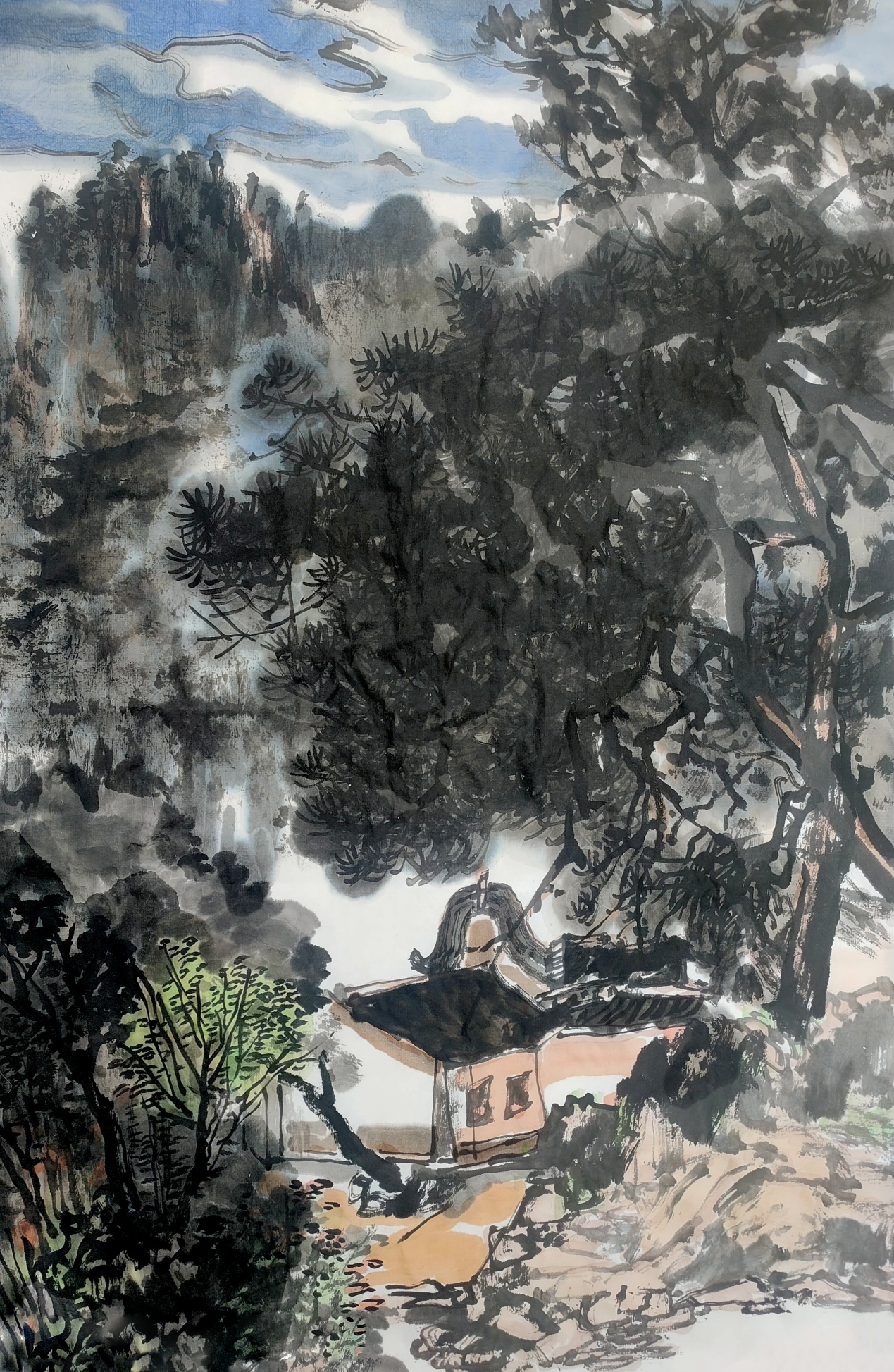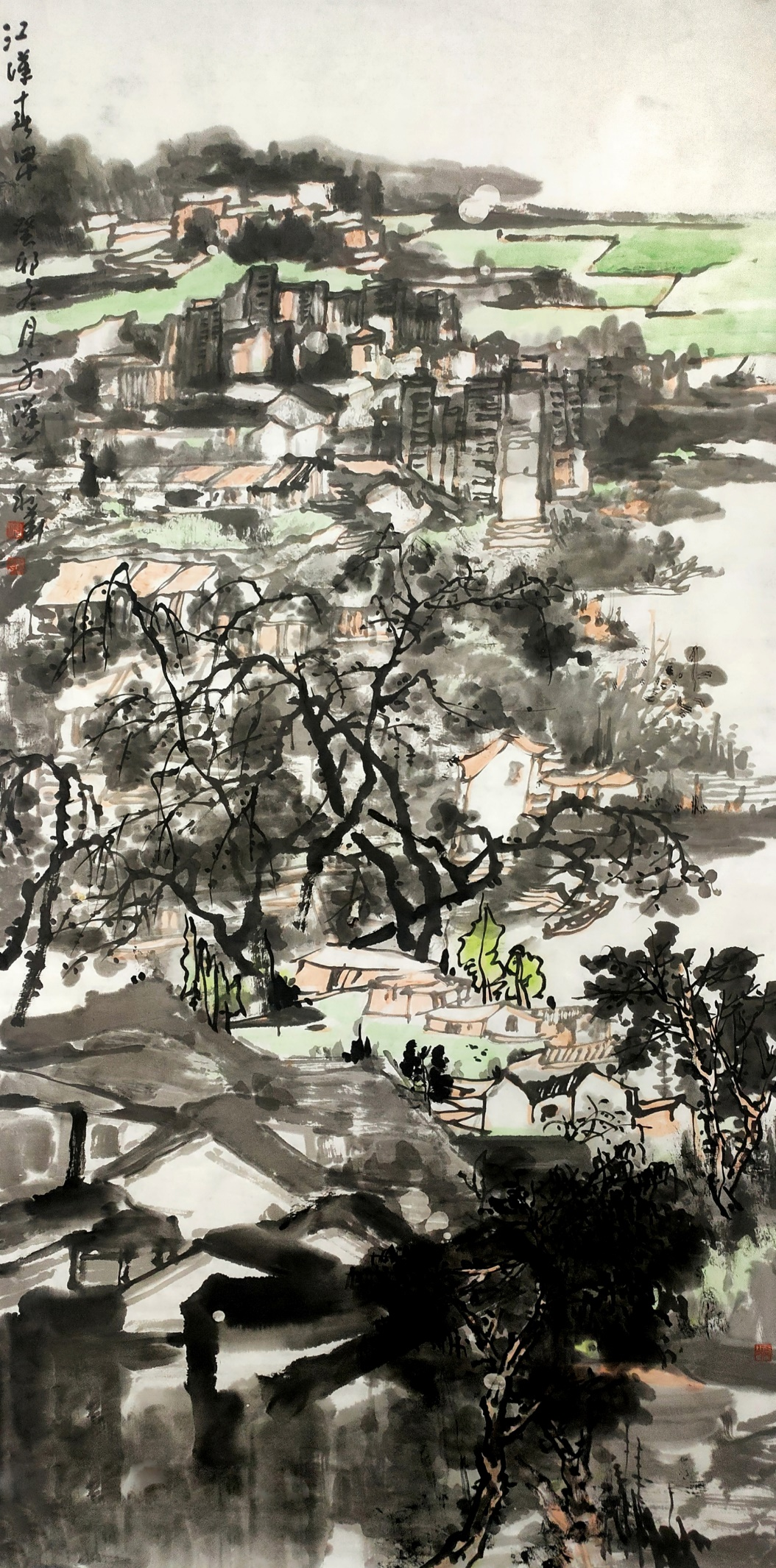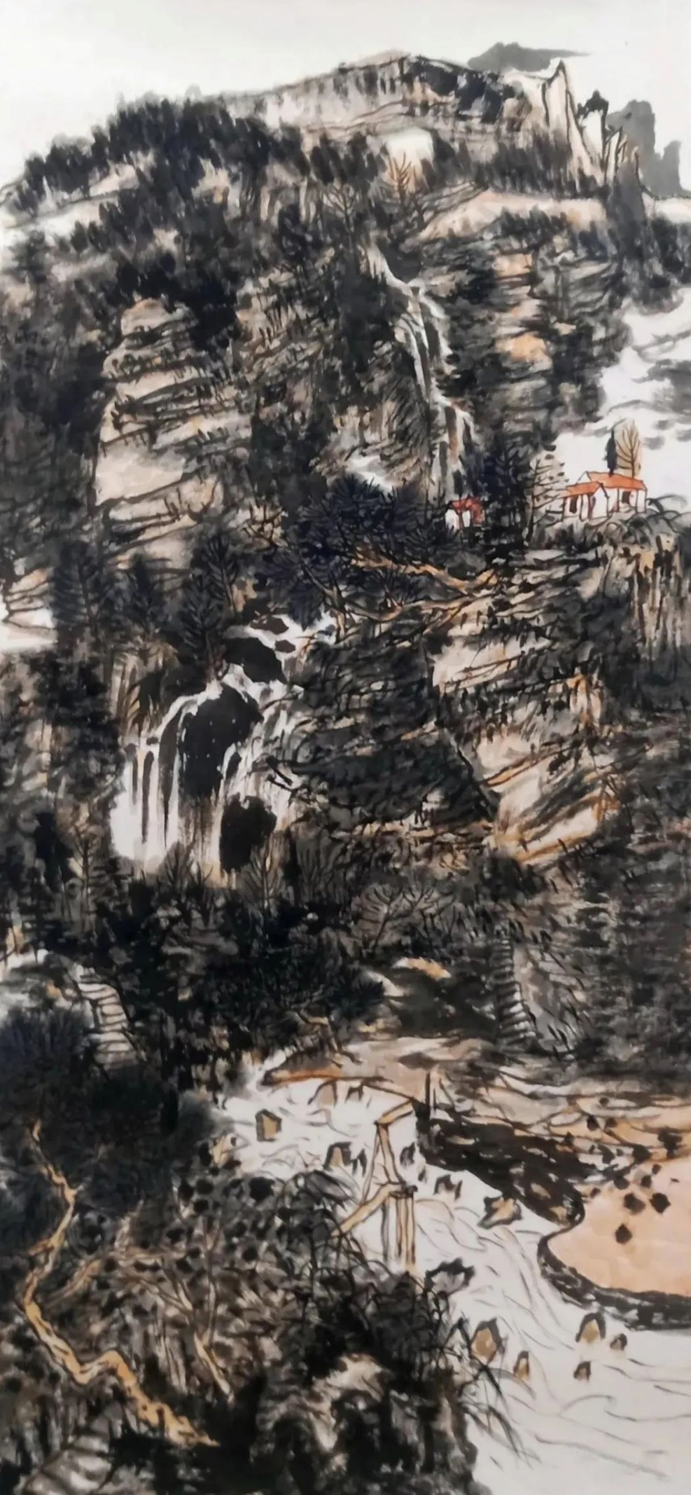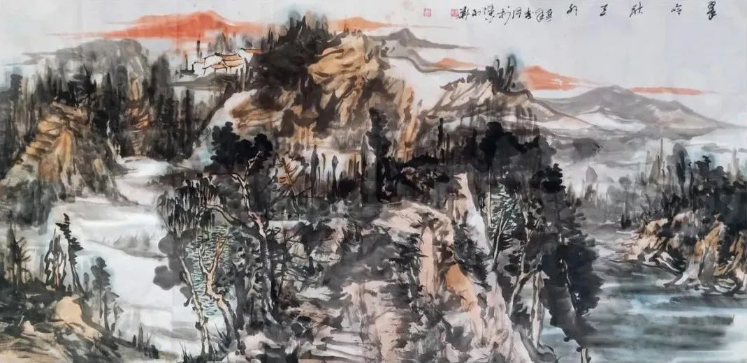 最为得意的妙招是,城在山中,房在城中,树在巷中。山因水而活,城因树而绿。绿色的生态城,为观者塑造了一个充满生机的梦境。细心的人还会发现,他笔下的树木与山石的披麻皴与折带皴融为一体,很难分辨出谁是树木谁是山石。其实,读画读出似是而非的感觉,这才是画家让你产生一种高级的审美意趣,无疑会产生共鸣,享受快乐的美感。利华画画是玩墨高手,传递文人画的正大气象,其当下盛行俗不可耐的市场画,根本无可比拟。他又是创新大伽。在构图上,大胆引用油画的块面与色彩,让画面新颖夺目,以致赋色上一改“黑利华”之旧风,高洁的鹅黄,高雅的石绿,高贵的浅黑,以文人画之浅洚淡雅写之,画面清趣呼之欲出。