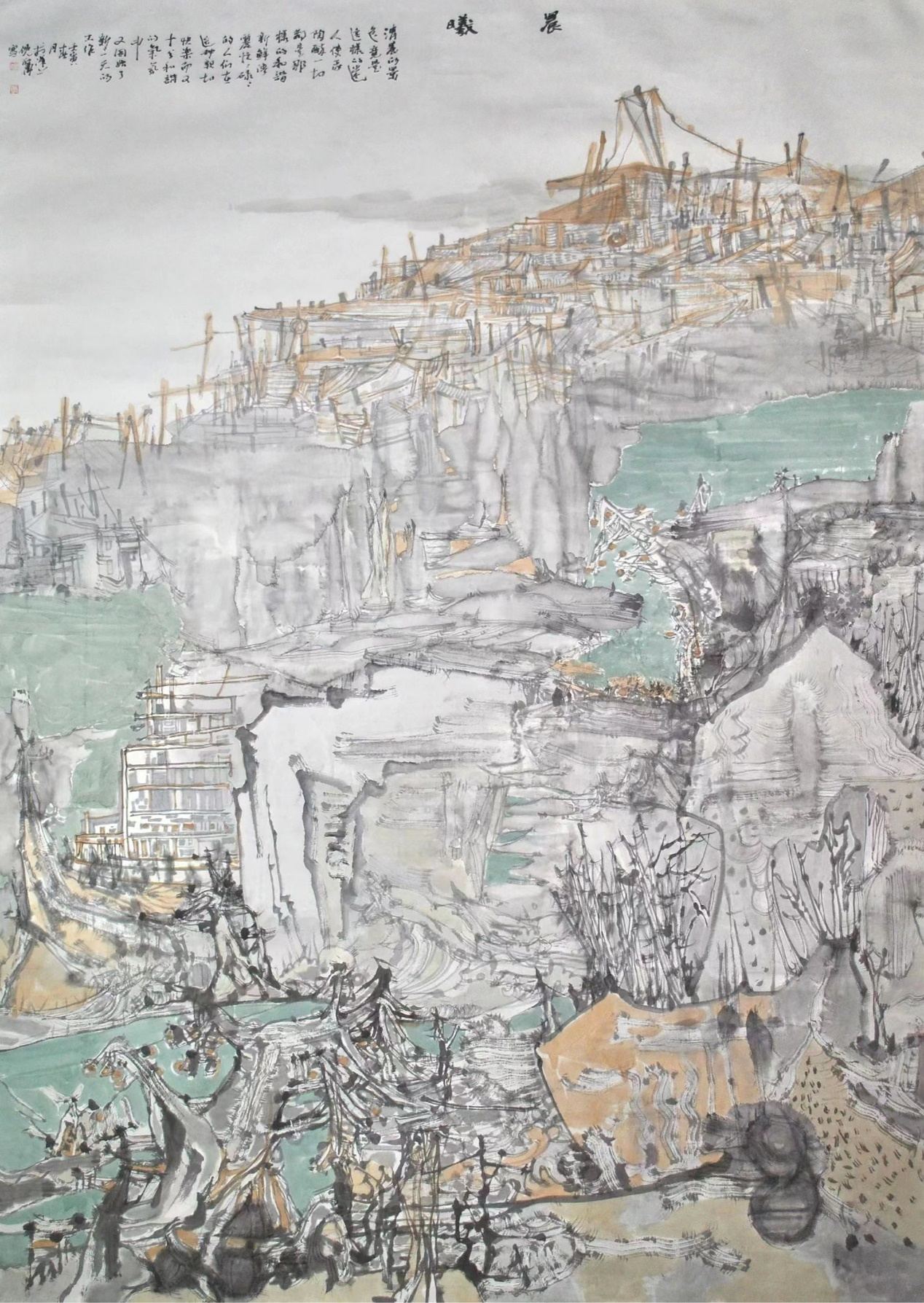 利华的画从心抒发自我之性情,揭示物象之性状。他也明白这样画画,吃亏不讨巧。一幅幅黑咕隆咚的画,一条条明晃晃的线,让观者一下子不知所云,让市场敬而远之,而他不离不弃,乐不可支,执意坚守自己的世界。《晨曦》微明,前景祥瑞。这作品风格迥异,令人耳目一新。如清风徐来,伊心静怡。还是线的魅力,支撑起整体画面。竖线如织,山河无恙,横线如阁,房屋有韵。一组组纵横交错的线,抒写火热的生活,寄托诗和远方。房屋、树木、船舶、桅杆自线中有序穿插,将画面支撑起来。