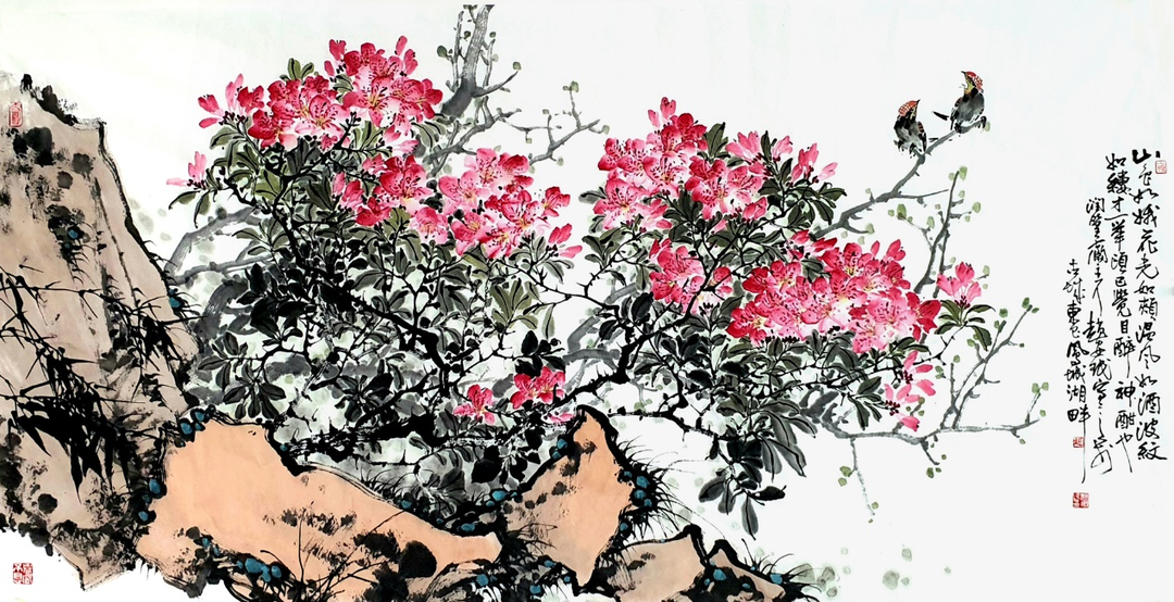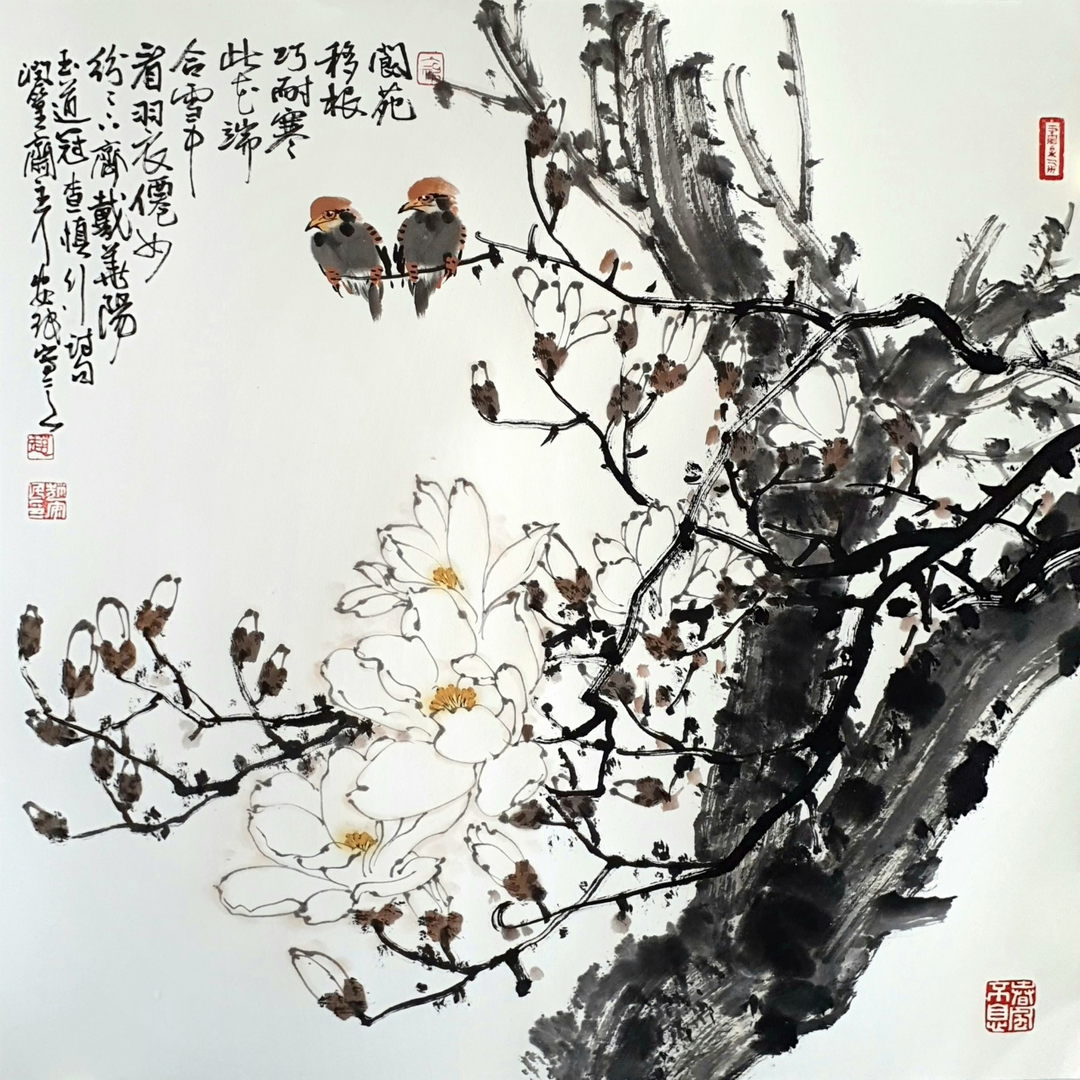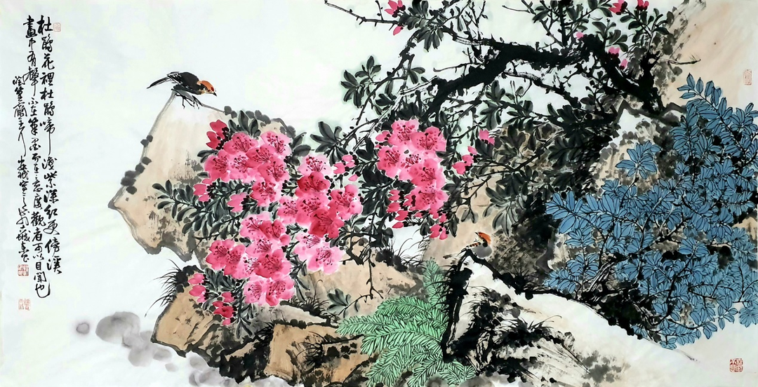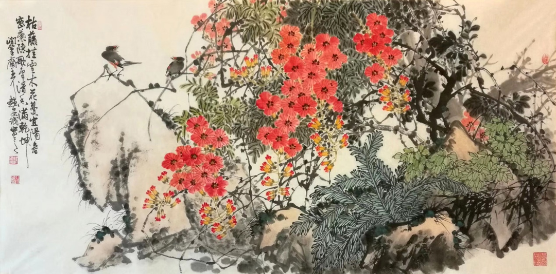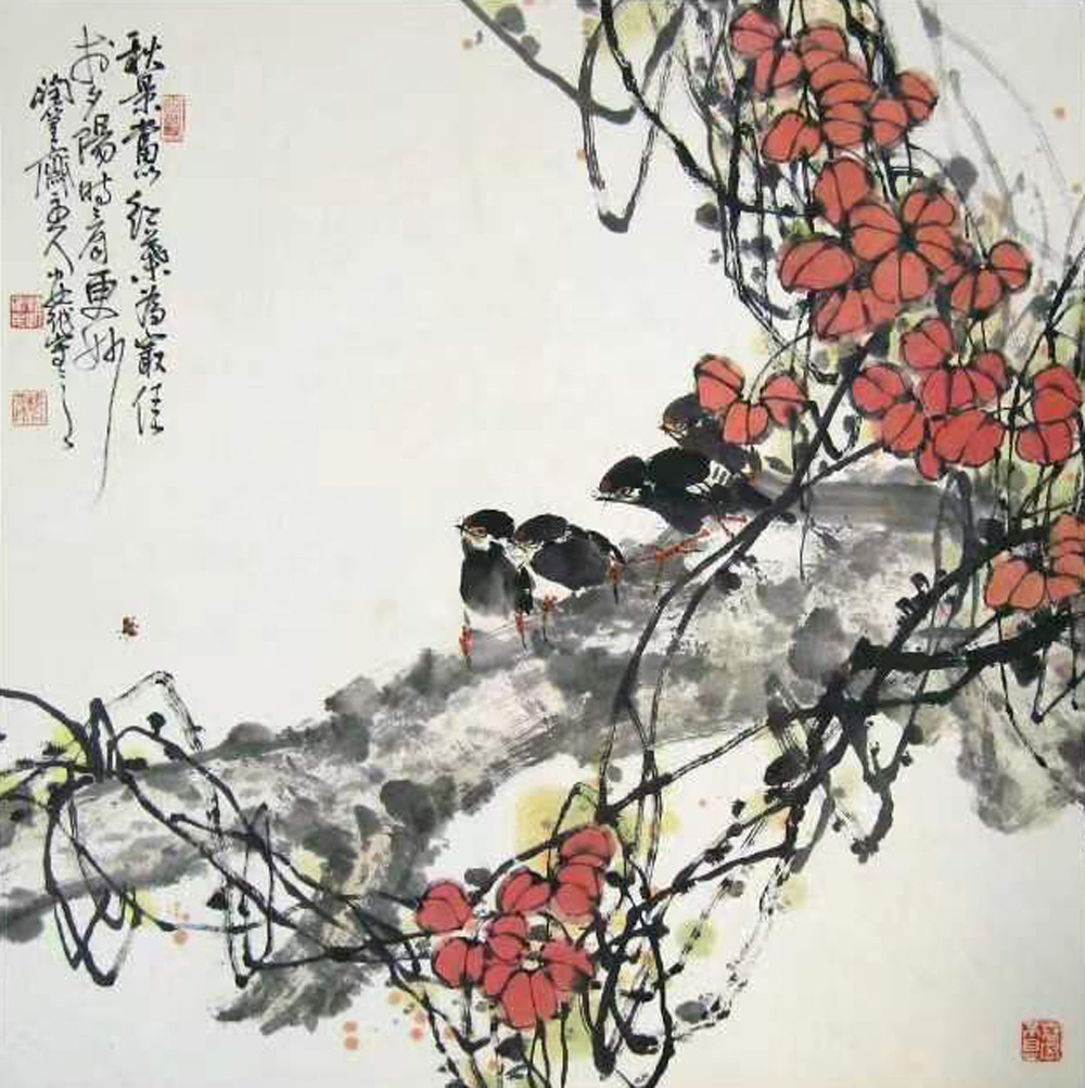 山东画家赵安民的写意花鸟画既具有深厚的传统功底,又具有鲜明的个人风格。他坚持“继承传统,发展创新”之路,倡导“笔墨当随时代”,追求艺术的真、善、美。他的写意花鸟画气势浑厚、构图大气、结构严谨、笔精墨妙。他以大胆的用色展现出清新、灵动的自然世界,透露出自己对生活的热爱,并使画面彰显出浓郁的生活气息和鲜明的时代特色,给人一种美的享受、净化心灵的愉悦感和强烈的视觉冲击力。 ![]()
