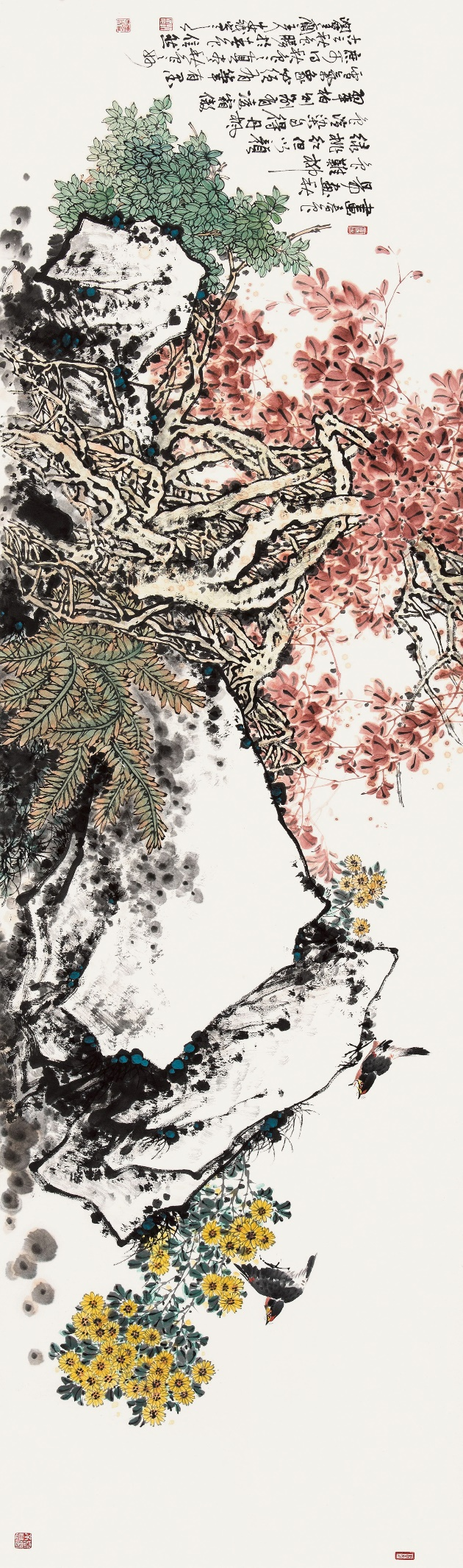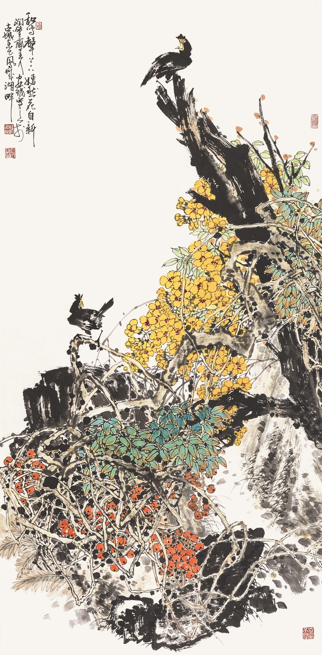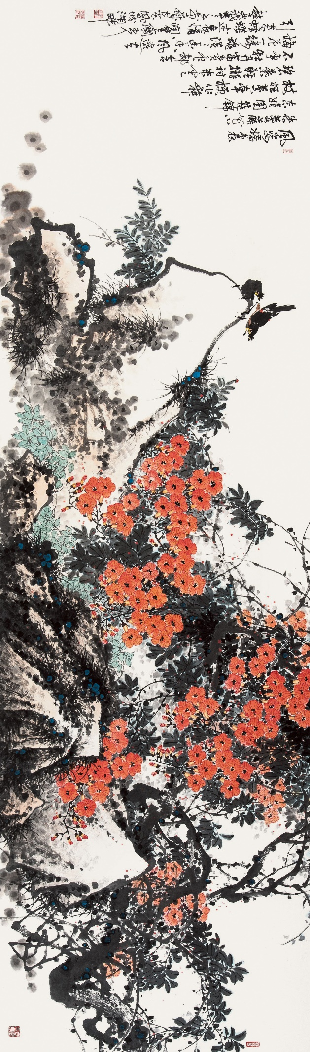 山东画家赵安民的写意花鸟画既具有深厚的传统功底,又具有鲜明的个人风格。他坚持“继承传统,发展创新”之路,倡导“笔墨当随时代”,追求艺术的真、善、美。他的写意花鸟画气势浑厚、构图大气、结构严谨、笔精墨妙。他以大胆的用色展现出清新、灵动的自然世界,透露出自己对生活的热爱,并使画面彰显出浓郁的生活气息和鲜明的时代特色,给人一种美的享受、净化心灵的愉悦感和强烈的视觉冲击力。 ![]()