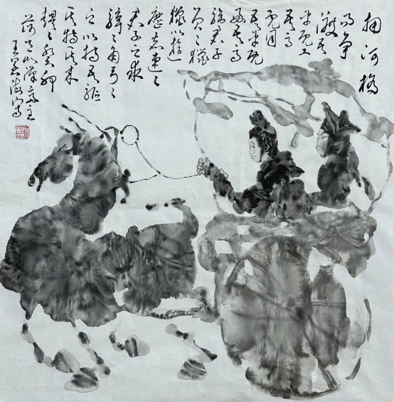 今天这一批博古系列作品却告诉我们,他在没骨法的探索上已经走到了诀别前人的地步。我们看到,连勾带染的线性式用笔在这里不见了,剩下的只有水渍和墨迹,以及偶尔闪现的微茫的色光。一种透明的水色调代替了传统没骨法的粗笔浓墨。无论人物、车马、空间陈设还是人物手中的道具,画中的形象似乎全由泼墨加冲水、撞水形成,可是这些方法的不确定性却未导致轮廓的歪曲和形象的解体,观其画,远望保持了画像石完整的剪影,近看充满浑厚的体量和富有质感的细节。但整个物像却是透明的,仿佛背后承受着光的照耀。要是我们把民间艺术的因素考虑进来,则可能第一个对皮影戏产生感性的联想,因为画中的形象俨然是一团光,一簇影,影影绰绰,晃晃荡荡,如绽放的涟漪,刚刚成形却又要消失,如躲在幕后的皮影,看得见却抓不住。凭借出色的手感,画家把一种非控制性力量,朝着它的反方向,演化成了一种可操控的力量,然而却同时把可控与不可控两者争斗的余影残留到我们眼前,令我们的注意力不敢松懈。 ——吴永强(艺术批评家、四川大学教授、博士生导师)