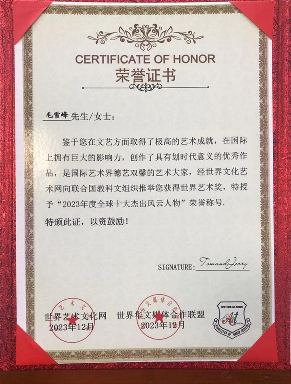 Mr. Mao Xuefeng was invited to give speeches and academic presentations at multiple universities both domestically and internationally. In 2008, he was invited to give a speech on the theme "Innovation is the Ladder to Climb" at the Centennial Lecture Hall of Peking University. In 2013, he was invited by Marietta University in the United States to hold a solo exhibition and gave speeches to teachers and students on the topics "Reading America" and "The Kiss of Chinese Ink and Western Colors". In 2014, he was invited by Lanzhou University to give speeches on November 10th on the establishment and development of heavy colored landscape painting and my artistic life. In 2016, at the invitation of the University of Sharda in New Delhi, India, he gave a speech titled "Journey of the Silk Road". Mr. Mao Xuefeng has served as an academic host for the nomination of Chinese innovative artists multiple times.In June 2023, I was invited to give a speech on "Art is Life"to the School of Art and Design at Beijing Forestry University. He has served as the first president of the Xinjiang Autonomous Region Calligraphy and Painting Research Institute,executive vice president and secretary-general of the Xinjiang Silk Road Calligraphy and Painting Institute, and deputy director of the organizing committee for the National Contemporary Landscape Painting Exhibition. I am currently a member of the Chinese Democratic Progressive Party and a national first-class artist. President of Beijing China Western Painting Academy, President of China Zhongcai Landscape Painting Academy, Executive Director of the Democratic Progressive Central Kaiming Painting Academy and Honorary President of Xinjiang Democratic Progressive Kaiming Painting Academy, Vice Chairman of the American Chinese Artists Association, Vice President of the Canadian World Artists Federation, President of Beijing Damei Painting and Calligraphy Academy, Director of Beijing Mao Xuefeng Art Museum,President of Beijing Xiongfeng Science and Technology Cultural Research Institute, and Vice President of China Shiqi Art Research Association Honorary Dean of the Confucius Institute of Calligraphy and Painting in China. Visiting professors andmaster's supervisors at Lanzhou University, Yangzhou University, and Beijing Forestry University, as well as visiting or part-time professors at the National Academy of Arts in Japan, Hong Kong Institute of Art in China, Charlotte University in New Delhi, and Dingxi Normal University in India.Vice president and researcher of the Xinjiang Landscape Painting Research Institute at Shihezi University in Xinjiang, specially appointed painter at Jiangsu Provincial Academy of Traditional Chinese Painting, director of the China Ethnic Minority Promotion Association under the Ministry of Culture,and academic host of the nomination event for Chinese innovative artists, Honorary President of the Chinese Landscape Painting Research Association. ![]() ![]()