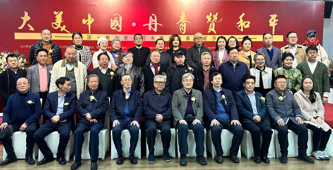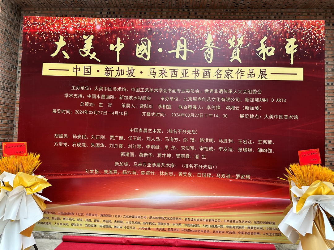 展览开幕合影 2024年3月27日下午由大美中国美术馆、中国工艺美术学会书画专业委员会、世界非遗传承人大会组委会主办,北京原点创艺文化有限公司,新加坡 ANNI D ARTS承办的《大美中国-丹青赞和平》中新马名家书画作品交流展在北京大美中国美术馆盛大开幕!出席开幕式的有关领导、艺术家、媒体和嘉宾共计一百多人。 中国文联原组书记、中国关心下一代工作委员会常务副主任-胡振民,全国工商联原常务副主席、全国人大法律委员会原副主任、北京市原副市长、中国画院院长孙安民,原中央国家机关美术家协会艺术顾问刘正刚、原国务院参事任玉玲、中国书画报社长、天津美院教授路洪明,荣宝斋画院教授、北京文史馆馆员马海方,中国水墨画院副院长吴彤,中国工艺美术学会书画专业委员会副会长、秘书长方宝龙,中国水墨画院办公室主任、教授马胜利,中国美术家协会第九次全国代表、长江师范学院美术学院客座教授,九州画院副院长、辽宁大学书画艺术研究院客座教授邵璞,锦珑文创产业园董事长庄再强,世界非遗传承人大会秘书长朱连强,中央文化管理干部学院艺术学院原副主任曾陆红,大美中国美术馆馆长李相宜以及此次活动总策划左贤、策展人李剑锋等出席了开幕式。 国内参展艺术家有胡振民、孙安民、贾广健、刘正刚、任玉岭、刘人岛、路洪明、马胜利、马海方、王宏江、王宪荣、方宝龙、石砚洗、朱国华、刘舟霞、刘红琴、邵璞、李炯峰、吴彤、宋伯军、宋祖成、李友迪、张璟煜、邹昀伽、郭建国、葛新华、蒋才坤、管丽霞、潘生等。 新加坡、马来西亚参展艺术家有刘太格、朱添寿、杨六南、陈祺竹、林辉忠、黄奕泉、白国樑、马双禄、罗家慧。此次展览持续4月10日,展期15天。