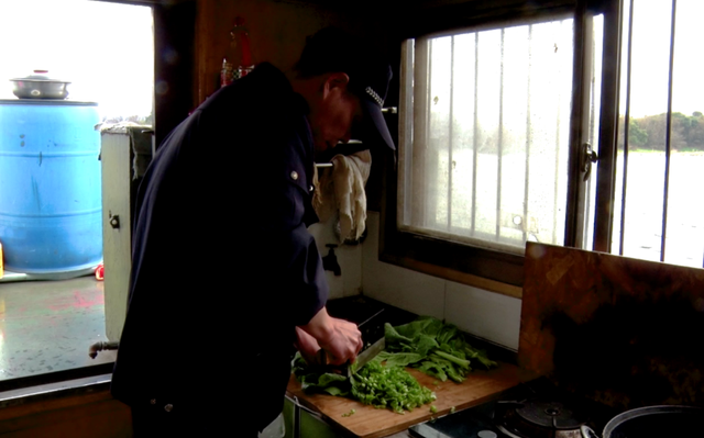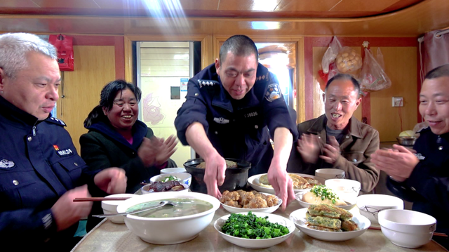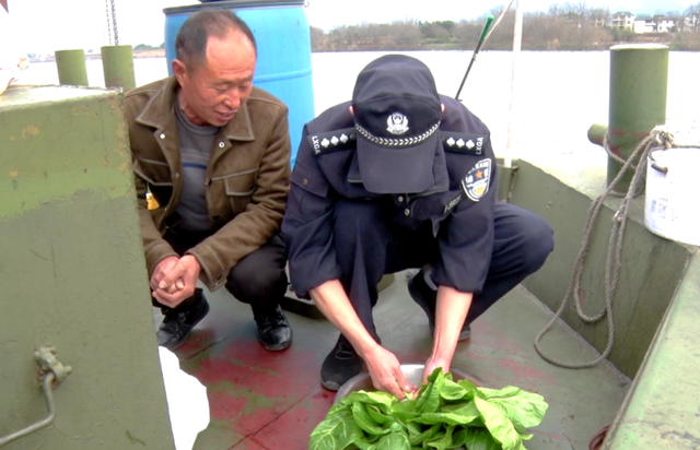 公安巡逻艇慢慢停稳后,艇舱内陆续走出四位内着警服、外着救生衣的警察,他们有的端着蒸锅,有的提着鸡蛋,有的拿着蔬菜……中年男人接过警察递来的蒸锅,小心走进船舱。