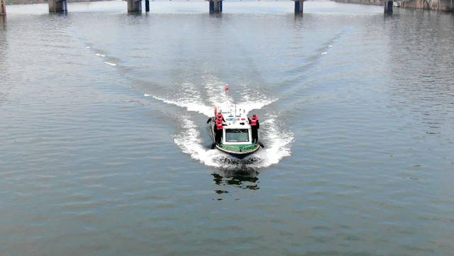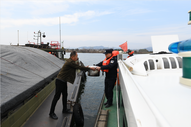 知道这个情况后,大年二十八下午,兰溪市公安局水上派出所副所长童庆钧带领所民警、辅警,带着几个兰溪特色菜,开着巡逻艇,来到了停靠在兰江女埠码头的货船里。