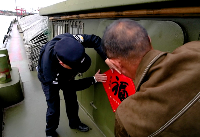 细心的民警还带来了“福”字,贴在船舱外,给船家增添春节气氛。