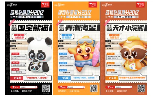 京东618“热爱狂欢趴”配备创意化的故事背景,其中“动物联萌”的IP动物设定也别具一格。35个小动物性格迥异,有热爱健身的弄潮海星、爱摄影的国宝熊猫、热爱美食的干饭羊驼、热爱阅读的文青雪纳瑞、热爱设计的天才小浣熊等等。软萌的形象设计和活泼俏皮的性格特点、霸气宣言都成功激发用户去晒、去分享给朋友们。